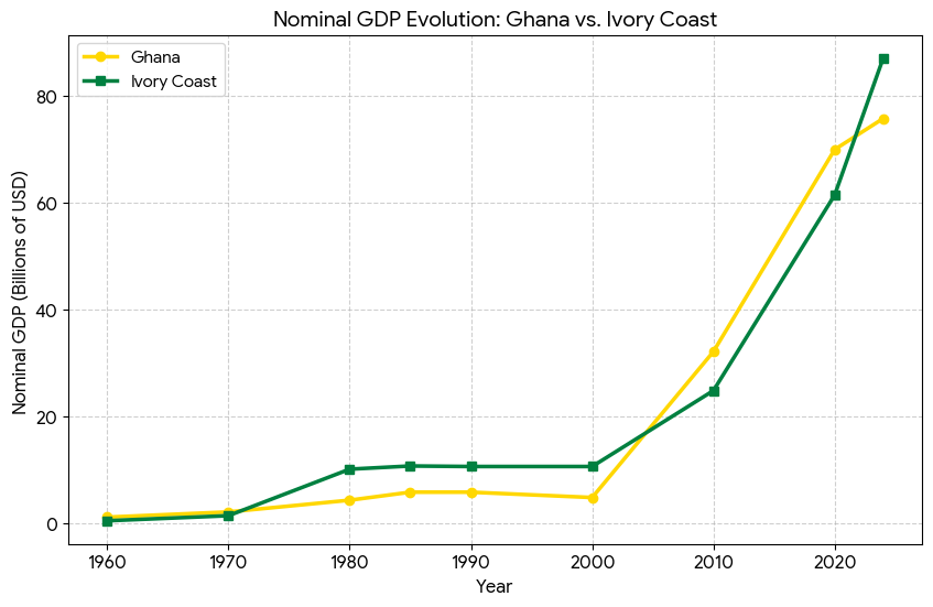 When many African colonies achieved national independence in the 1960s, a famous wager was made between Ghana’s President Kwame Nkrumah and Côte d’Ivoire’s President Félix Houphouët-Boigny over which country would be more prosperous in the years to come. At the time, Ghana was considered one of the most prosperous and promising countries in Sub-Saharan Africa and, compared to Côte d’Ivoire, possessed more natural resources (including gold mines), better infrastructure inherited from the colonial period, a more educated population, higher per capita income, and a booming cocoa industry.