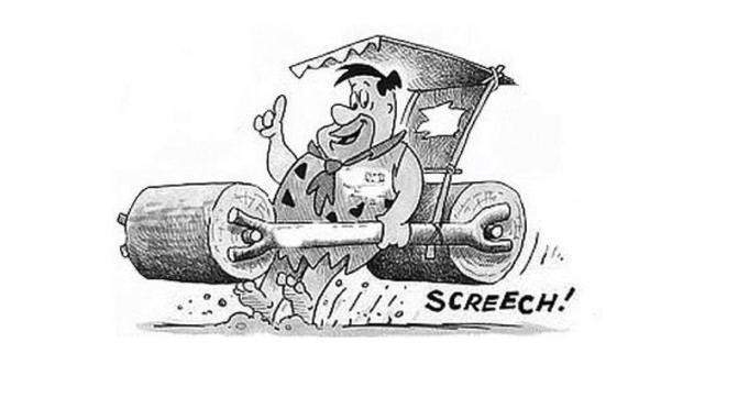 Cartoon de Fred Flinstone a travar o carro com os calcanhares